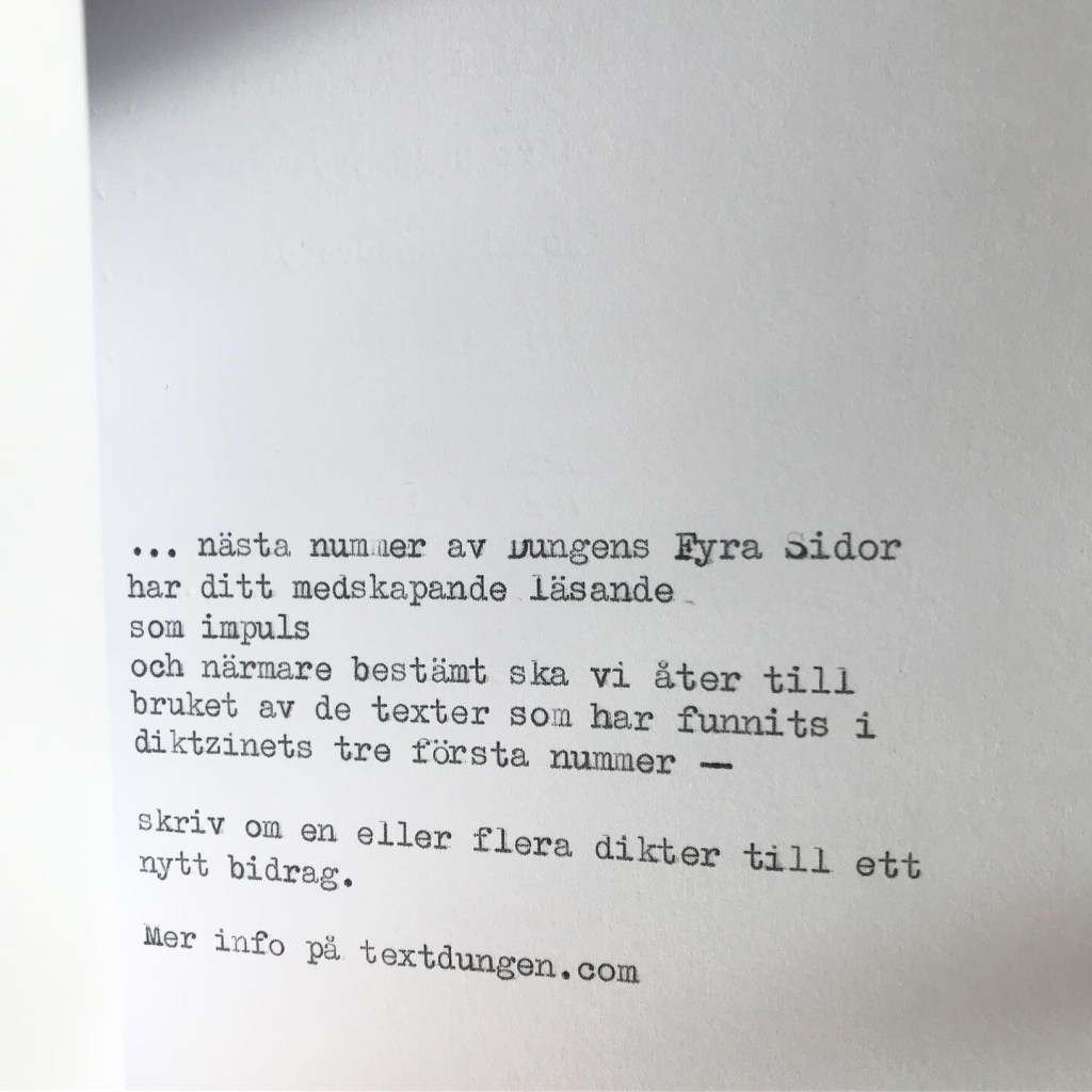 För den som vill skicka in en dikt till det fjärde numret av dungens diktzine finns följande anslag: