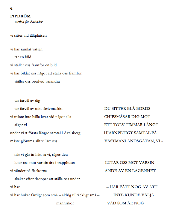 I den nionde luckan hittar vi en version av dikten ”PIPDRÖM”, skriven tillsammans med Daniel Westerlund som driver Hökarängens Antikvariat och kassettbolaget Qvästlafve.