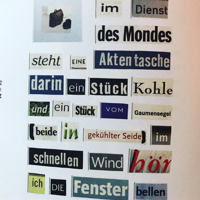 Själv gillar jag att göra kollage på danska, och gör ett kollage – och endast ett – var gång jag sätter mig på mitt skrivkontor. Utan undantag. Först tar jag fram Ud & Se, en gratis tågtidning som har blivit rena rama rariteten i denna märkliga tid utan resor, och så bara klipper jag ut ord och låter det växa fram något. Om jag vet vilket skrivande jag ska till, då får det gå raskt till, och om jag inte vet, då tänker jag mer genom kollagets framväxt…