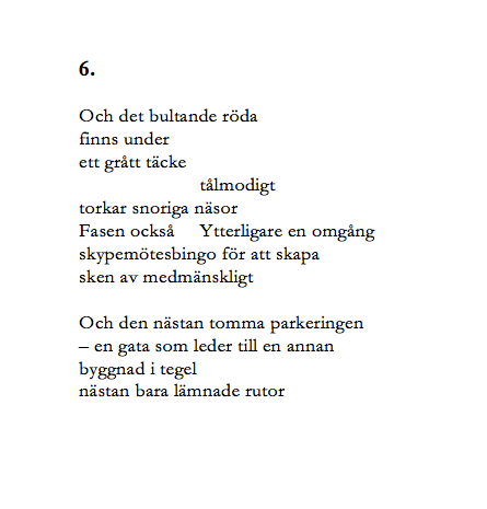 Lucka sju är framtagen med Rut Berling. Vi hade var sin dikt i bakgrunden, i ”smygen”, medan vi skickade rader till varandra. Dessa poeter i fonden syns eller syns inte nämnvärt för läsaren av luckan – ja, vad vet man bländad av skrivandet.