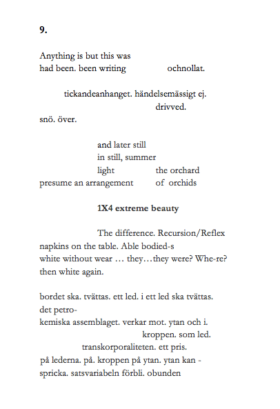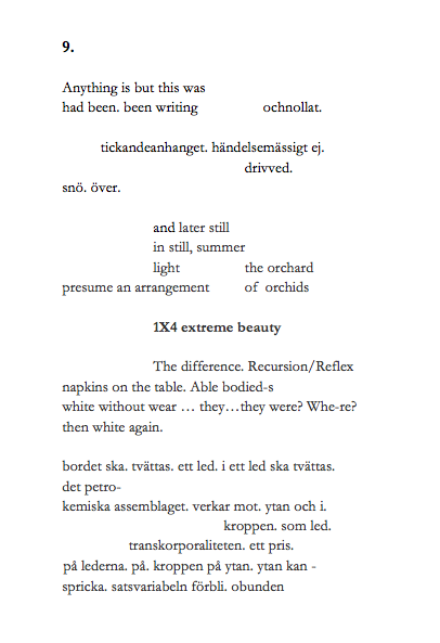 Jag läste en halvtimme i ProponeisiS innan jag tog till orda här. Att det är en sjuhelvetes jävla bok, enligt mig, säger kanske sig självt. Denna gång rörde jag mig i det sista hundratalet sidor. Eller hundratalen. Det går inte att erfara mängden, antalet, genom de tunna arken. (När ett ark knappt finns, och orden, på dem, finns (och försvinner) desto mer. Ett galet bläddrande förestår så snart man börjar bläddra efter något specifikt.) Det är mycket av den här varan i bokens avslutande delar: ”OPPOSITIONEN FINNS INTE”. Men det är inte en morgon (för) att bli nedslag.