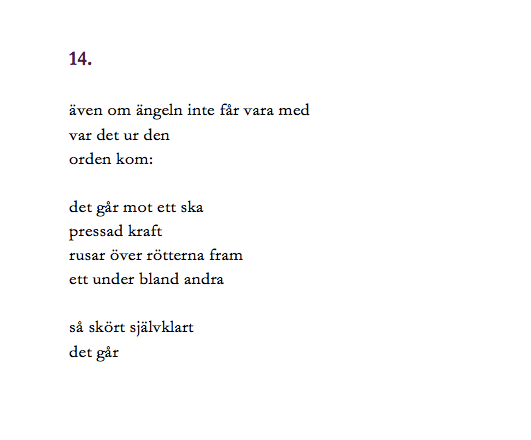 Du har knäckt rimkoden. Nu hittar du ohämmat till egna rim och blandar de lexikala orden, den basala maten, riskornen, med egenhändiga ord, ett strössel. Att sådant som -ölande är tacksamt i mun och hjärna; hölande, du hör ju; sölande finns men inga språkregler skulle hindra ett hölande från att finnas. Vi kan få det att finnas. I att börja rimma finns ett världsskapande. Vi har väntat på det här, tillsammans. Det känns. Vi tittar en bit fram och går. Det finns lediga rum för fler ord enligt de regler vi måste ge vårt ja till.