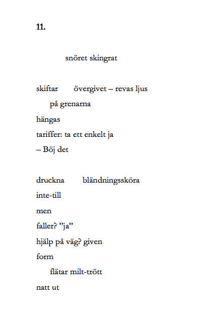 Hos mig var Friederike Mayröckers dikt ”om att kyssa handflatorna på förvåren” med under skrivdagarna. Den dikten finns i Om omfamningar, i översättning av Ulla Ekblad-Forsgren, också den på ellerströms förlag.