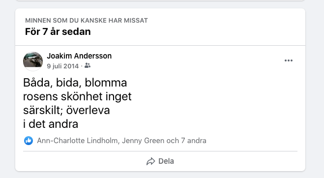 Här kommer en dikt av Anna Greta Wide, att grunna och leva vidare på: