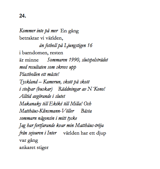 Ja, allting bara finns. Det är då som i den där dikten av den danska poeten Inger Christensen. Hon som skrev att juninatten finns, och så fanns det. Samma sak med den torra gräsängen. För gräsängen finns. Gräsängen på skärgårdsön finns. Aprilhimlen över gräsängen på skärgårdsön finns. Och i allt detta så finns också jag.”