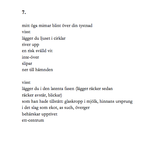 Själva platsen där texten står att läsa skiljer ut – mina läsningar. Jag läser dikterna bättre i mailen än i Word. Det finns en annan koncentration – paradoxalt nog – när jag klickar fram texten i malströmmen mailen. Nånting får mig att läsa med vilja, med kroppen, med relationen, historia, just där. Så konkret är det: i mitt skrivande mailar jag ofta mig själv för att läsa (alltså Word) med den anordningen.